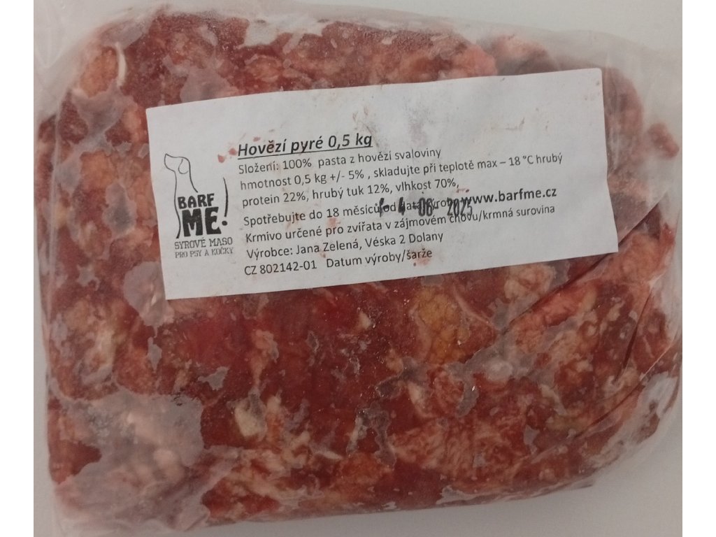 jemně mletá pasta z libového hovězího masa, balení 0,5 kg, vhodná zejména pro štěňata