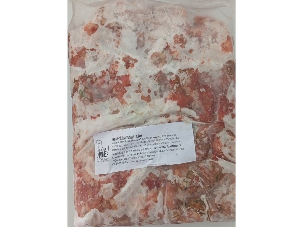 Hrubomletý krůtí skelet40%, krůtí svalovina mletá 45%, zelenina 15% ve složení mrkev, dýně, římský salát, brokolice.  balení 1 kg